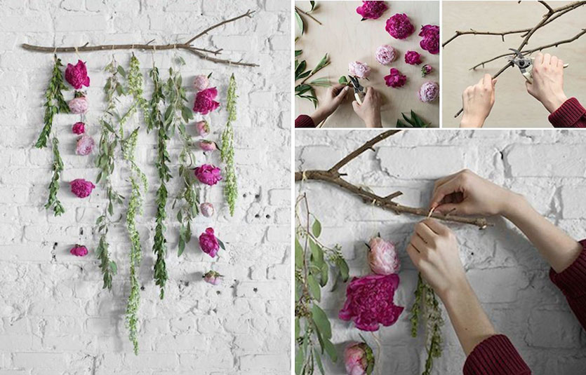 4. Create a floral bedhead by constructing a wall of blooms hanging from a sculptural branch attached to the wall. This boho chic idea does take a little time to pull together but is worth the effort for a special occasion or just sheer wow factor! Use flowers or green foliage that will hold up to this kind of treatment.