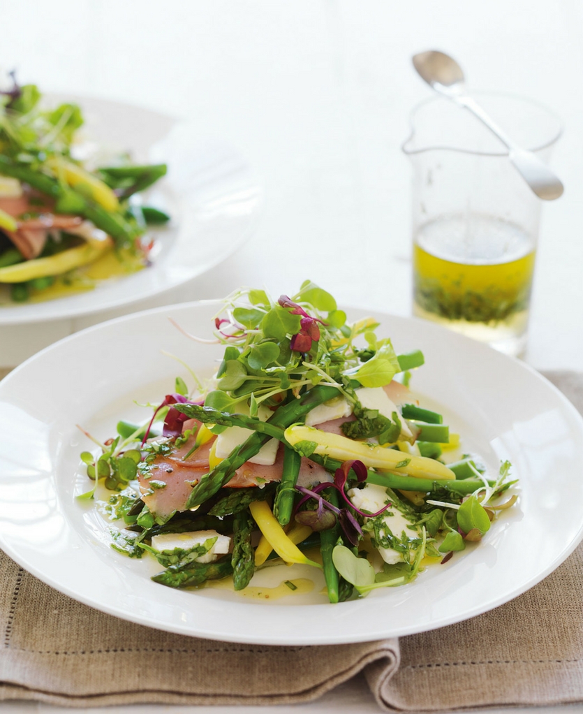 Bean, asparagus and ham salad with basil dressing