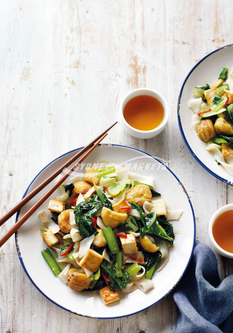 Step 3 Trim then slice bok choy and choy sum stems and roughly chop the leaves. Heat a wok over high heat until hot. Add 1 tbs oil and tofu and cook, tossing often, for 2-3 minutes until golden. Remove to a plate. Add remaining 1 tbs oil, garlic, ginger and chilli to wok and stir- fry for 30 seconds. Add bok choy and choy sum stems and stir-fry for 2 minutes. Add bok choy and choy sum leaves and oyster sauce mixture. Stir-fry for 2-3 minutes until leaves wilt. Toss through chestnuts and noodles and serve.