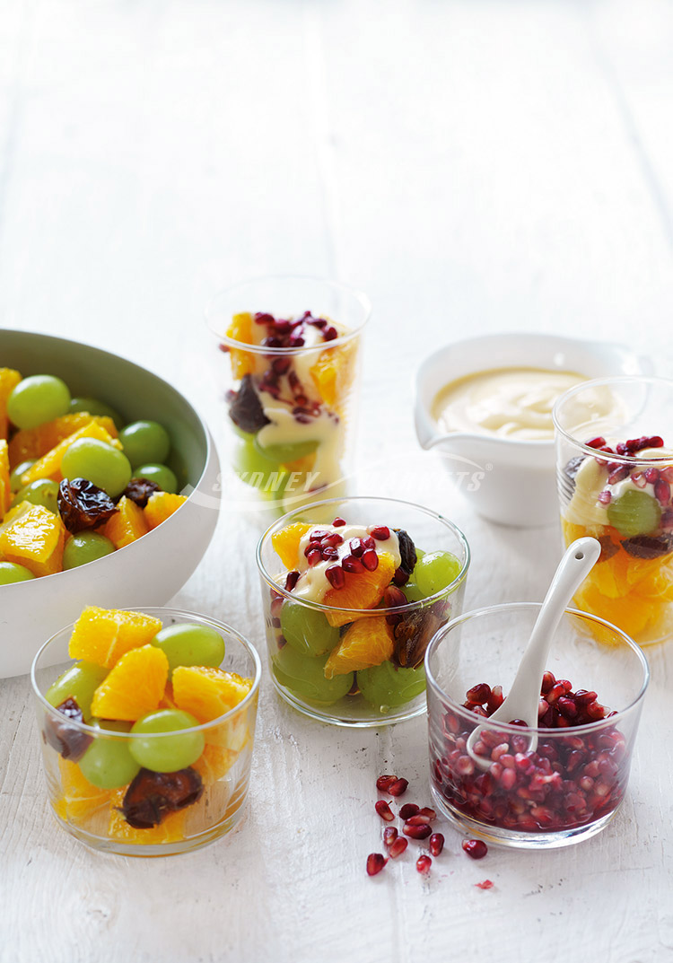 Step 2 To prepare pomegranate, hold pomegranate cut-side down over a bowl and using the back of a wooden spoon, gently tap pomegranate to dislodge the seeds. Remove and discard any white seeds or pith. To serve, spoon fruit salad into serving glasses. Top each with a dollop of custard, sprinkle with pomegranate seeds and serve.